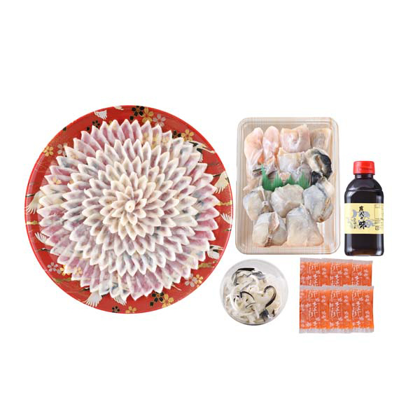 内容:とらふぐ刺身(33cm皿)160g、とらふぐ皮30g、とらふぐちり(切身、アラ)300g、ふくポン酢180ml、もみじおろし10g×6
