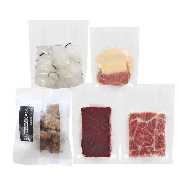 内容:鯨赤身肉(刺身用)100g、尾の身(尾肉)100g、鯨おばいけ100g、くじら竜田揚げ(油調済)80g、鯨ベーコンスライス50g
