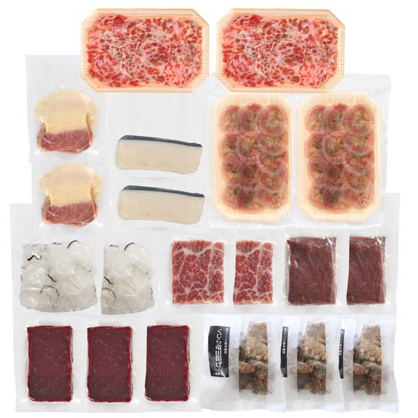 内容:鯨赤身肉(刺身用)100g×3、くじら竜田揚げ(油調済)80g×3、尾の身(尾肉)100g×2、鯨おばいけ100g×2、ハツ100g×2、鯨本皮スライス50g×2、鹿の子スライス50g×2、鯨ベーコンスライス50g×2、百尋スライス50g×2