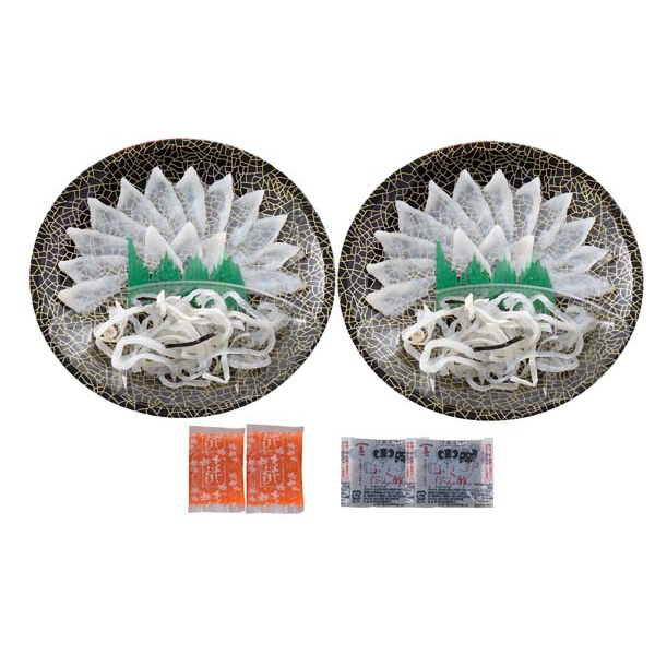 内容:真ふぐ霜降り刺身(17cm皿)20g×2、とらふぐ皮20g×2、ふくポン酢10g×2、もみじおろし10g×2