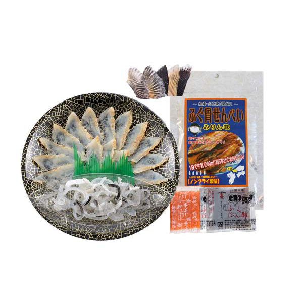 内容:真ふぐたたき刺身(17cm皿)20g、とらふぐ皮20g、ふぐ骨せんべい(みりん味)30g、ふくポン酢10g、もみじおろし10g、とらふぐヒレ5枚