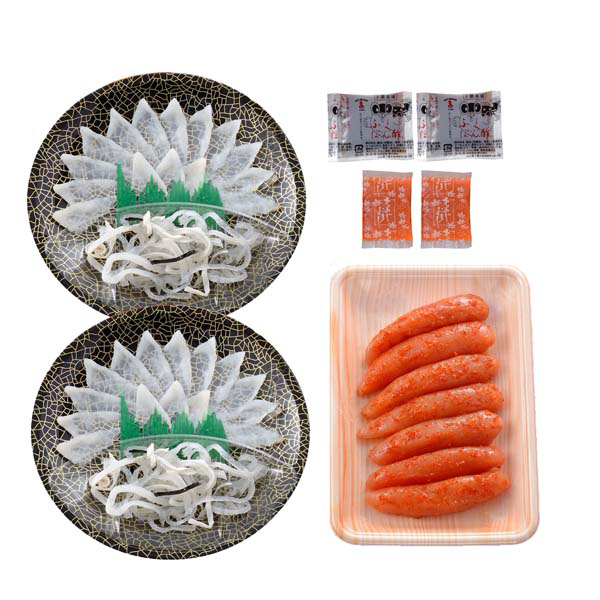 内容:真ふぐ霜降り刺身(17cm皿)20g×2、とらふぐ皮20g×2、辛子明太子250g、ふくポン酢10g×2、もみじおろし10g×2