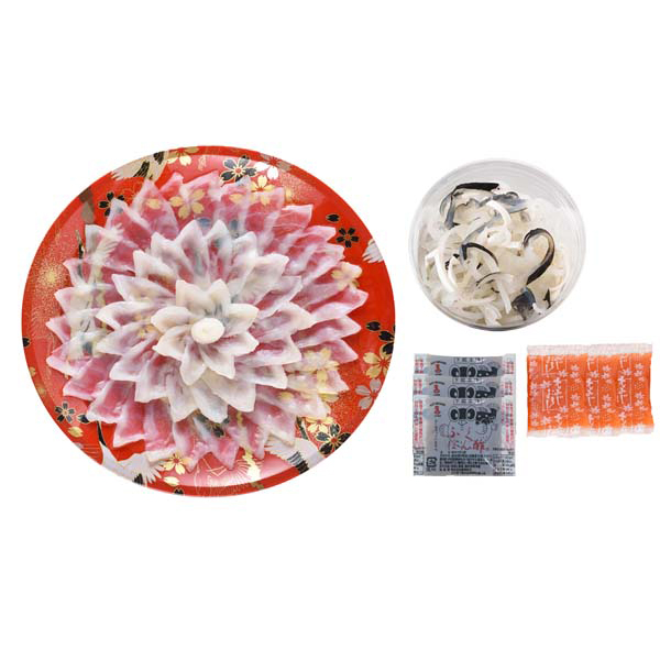 内容:とらふぐ刺身(22cm皿)65g、とらふぐ皮30g、ふくポン酢10g×3、もみじおろし10g×3