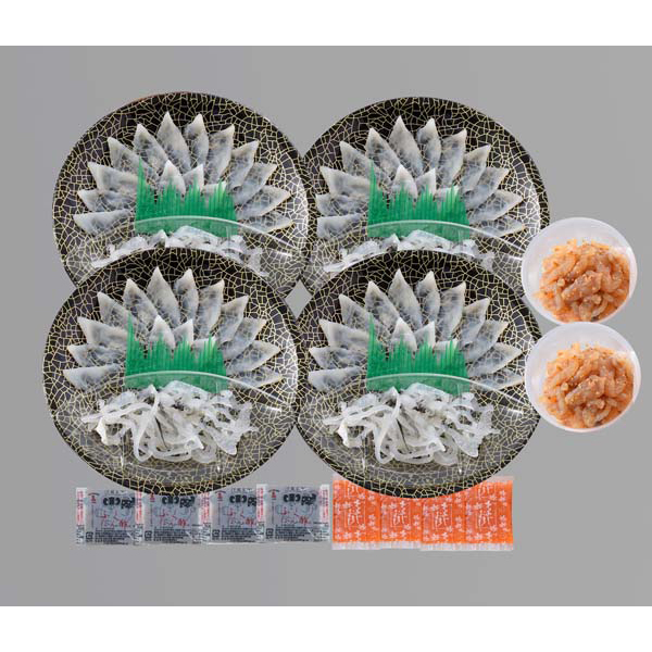 内容:とらふぐ刺身(17cm皿)15g×4、とらふぐ皮20g×4、とらふぐ塩辛60g×2、ふくポン酢10g×4、もみじおろし10g×4