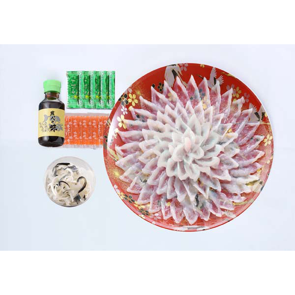 内容:とらふぐ刺身(30cm皿)135g、とらふぐ皮60g、ふくポン酢100ml、もみじおろし10g×4、かぼす果汁2ml×4