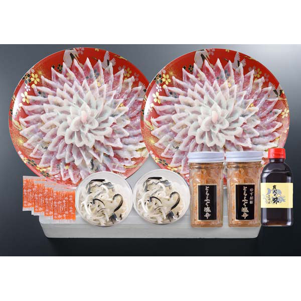 内容:とらふぐ刺身(30cm皿)135g×2、とらふぐ皮30g×2、とらふぐ塩辛60g、とらふぐ塩辛(ゆず胡椒風味)60g、ふくポン酢180ml、もみじおろし10g×4