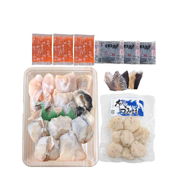 内容:とらふぐちり(切身、アラ)300g、ふぐつみれ100g、ふくポン酢10g×3、もみじおろし10g×3、とらふぐヒレ5枚