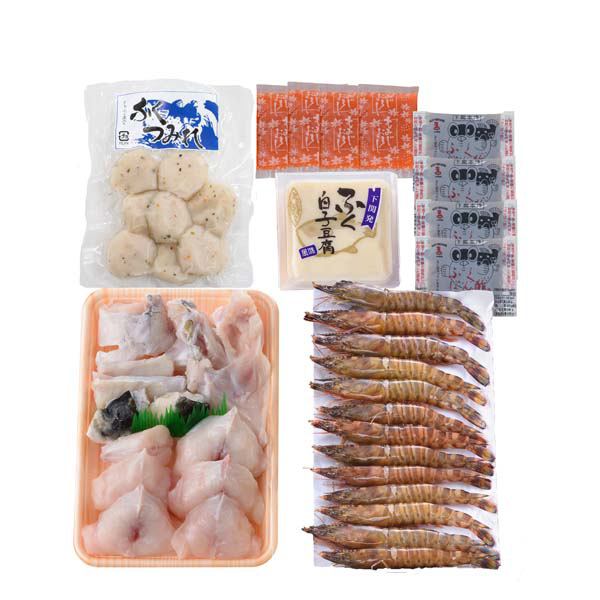 内容:ふぐちり(シロサバフグ切身、トラフグアラ)360g、車海老(刺身用)200g、ふぐ白子豆腐130g、ふぐつみれ100g、ふくポン酢10g×4、もみじおろし10g×4