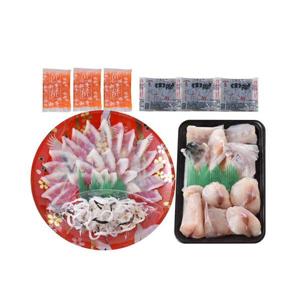 内容:とらふぐ刺身(22cm皿)40g、とらふぐ皮20g、ふぐちり(シロサバフグ切身、トラフグアラ)200g、ふくポン酢10g×3、もみじおろし10g×3