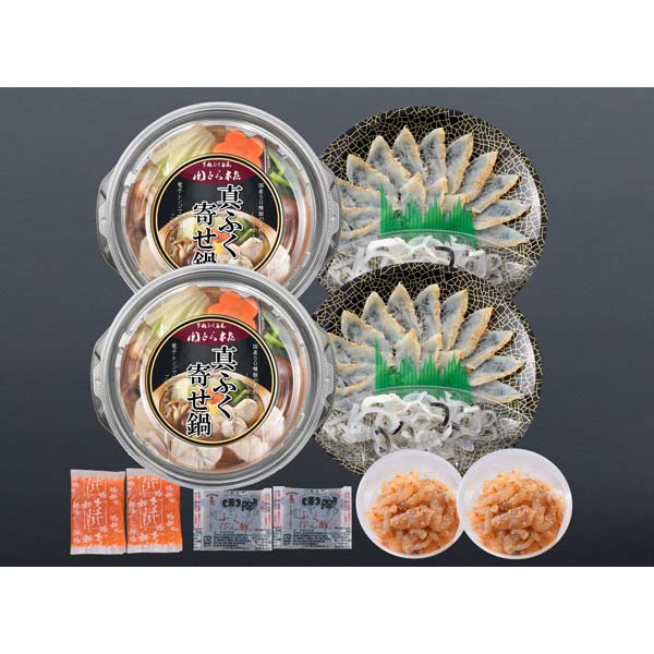 内容:真ふぐ寄せ鍋(個食鍋)300g×2、真ふぐたたき刺身(17cm皿)20g×2、とらふぐ皮20g×2、とらふぐ塩辛60g×2、ふくポン酢10g×2、もみじおろし10g×2