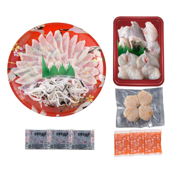 内容:真ふぐ霜降り刺身(22cm皿)45g、とらふぐ皮20g、とらふぐちり(切身、アラ)200g、ふぐつみれ40g、ふくポン酢10g×3、もみじおろし10g×3