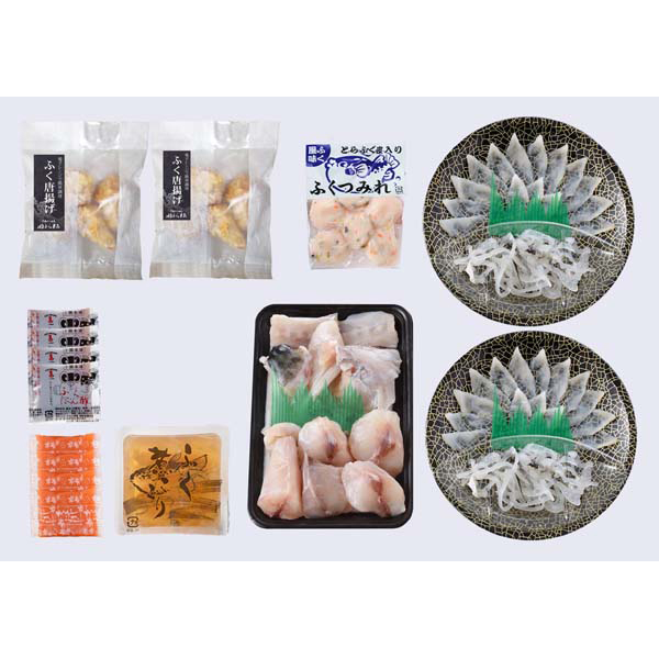 内容:とらふぐ刺身(17cm皿)15g×2、とらふぐ皮20g×2、ふぐちり(シロサバフグ切身、トラフグアラ)200g、ふぐ唐揚げ(油調済・骨付)80g×2、ふぐ煮こごり100g、ふぐつみれ80g、ふくポン酢10g×4、もみじおろし10g×4