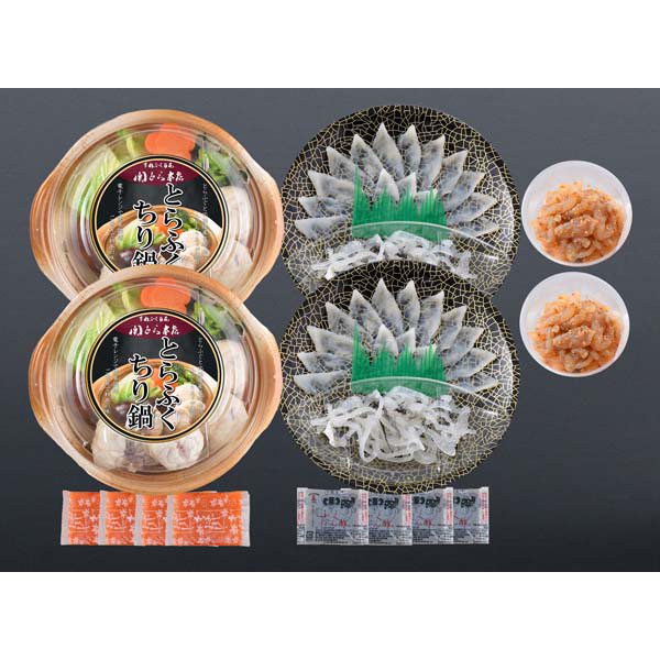 内容:とらふぐちり鍋(個食鍋)300g×2、とらふぐ刺身(17cm皿)15g×2、とらふぐ皮20g×2、とらふぐ塩辛60g、ふくポン酢10g×4、もみじおろし10g×4