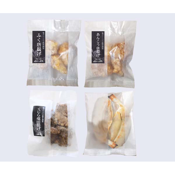内容:あんこう唐揚げ(油調済・骨付)100g、ふぐ唐揚げ(油調済・骨付)80g、くじら竜田揚げ(油調済)80g、ふぐ一夜干し(焼成済)80g