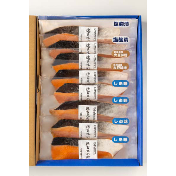 内容:桜鱒切身(しお味)70g×4、桜鱒切身(北海道大豆味噌)70g×2、桜鱒切身(塩麹漬)70g×2