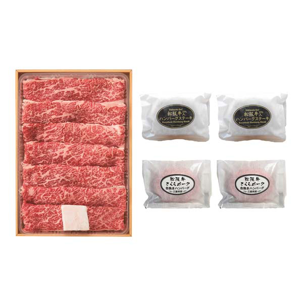 内容:松阪牛バラすき焼400g、松阪牛31%入り生ハンバーグ120g×2個、松阪牛とさくらポーク合挽生ハンバーグ120g×2個セット