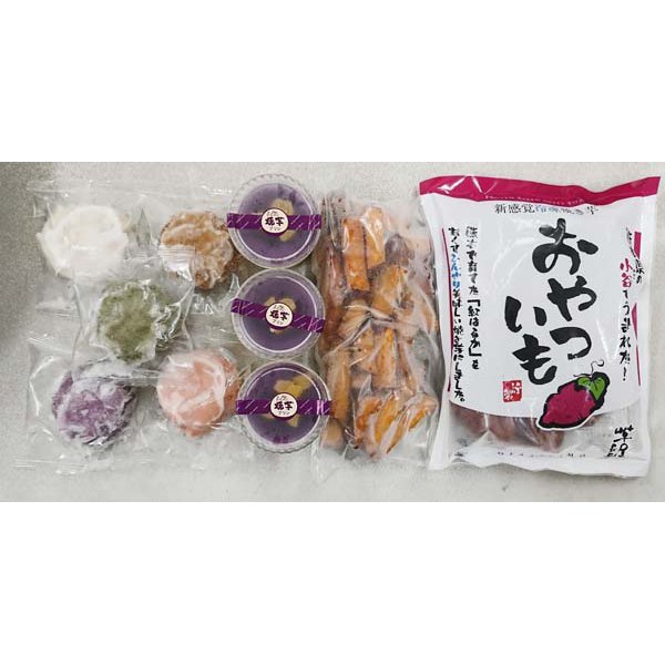 内容:いきなり団子(プレーン、紫芋、よもぎ、黒糖、さくら)各80g×各1、お芋棒(大学芋)300g×1、焼芋プリン120ml×3、おやついも(新感覚冷凍焼芋)500g×1