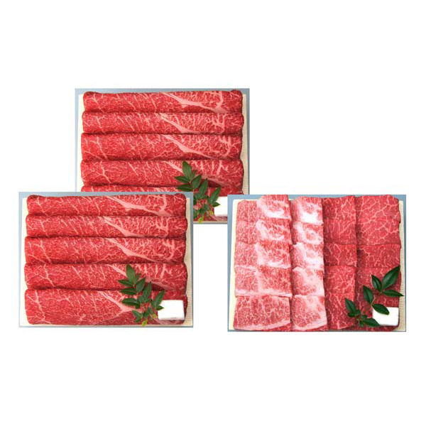 内容:すき焼き・しゃぶしゃぶ用(モモ380g)×2、焼肉用(モモ180g、バラ180g)×1