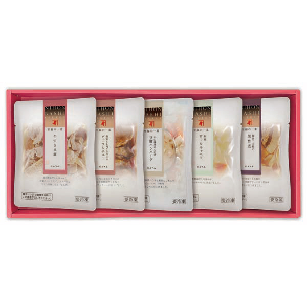 内容:(和風ロールキャベツ、豚肉と大根の黒酢煮、熟成ヒレ肉ときのこのビーフシチュー、かに湯葉あんかけ豆腐ハンバーグ、牛すき豆腐)×各1 計5