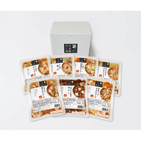 内容:(だし薫る和風ポトフ、だし薫るけんちん汁、だし薫る豚汁、なめこと豆腐の赤だし、和風ピリ辛カルビスープ、炒め玉ねぎのオニオンスープ、生姜入り肉だんごスープ)×各1 計7