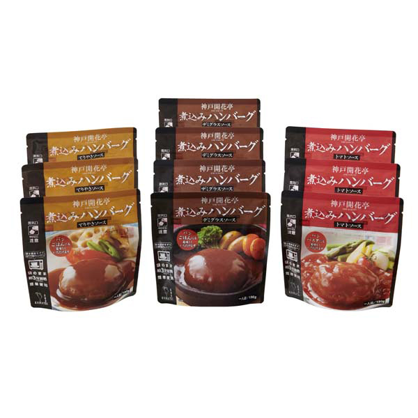 内容:煮込みハンバーグデミグラスソース190g×4、煮込みハンバーグトマトソース190g×3、煮込みハンバーグてりやきソース190g×3