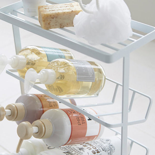 ボトルを仕分けて収納することが可能。ブラシなどを掛けることが出来るフック付き。接地面を傷つけないクッション付き。