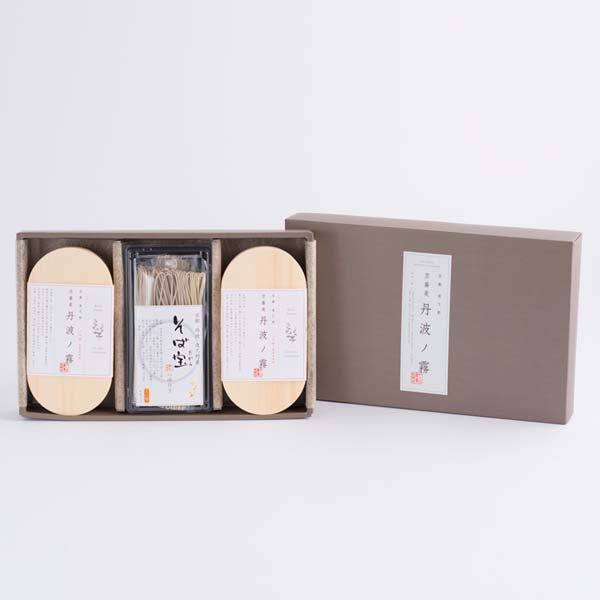 内容:半なま京蕎麦丹波ノ霧(木製わっぱ入り)(半なま麵80g×4、濃縮つゆ25ml×4)、半なまそば宝(半なま麵80g×2、濃縮つゆ25ml×2)