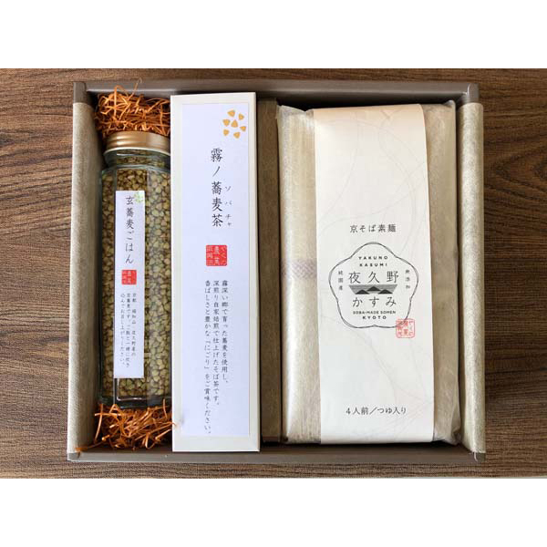 内容:京そば素麺夜久野かすみ(乾麵80g×4、濃縮つゆ25ml×4)、霧ノ蕎麦茶ティーバッグ入り7g×7、玄そばごはんの素130g×1