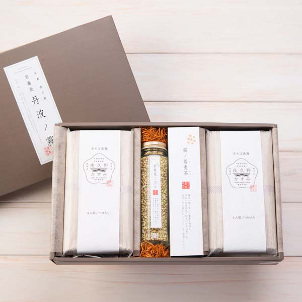 内容:京そば素麺夜久野かすみ(乾麵80g×8、濃縮つゆ25ml×8)、霧ノ蕎麦茶ティーバッグ入り7g×7、玄そばごはんの素130g×1
