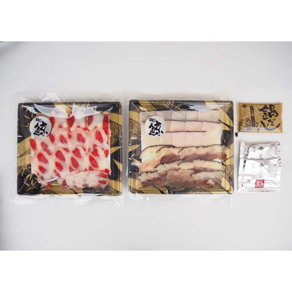 内容:くじら(鹿の子)100g、くじらタン(さえずり)40g、くじら皮60g、鍋だし55g、ポン酢30g×2