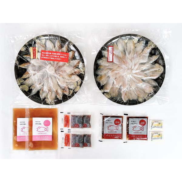 内容:のどぐろ炙り刺し120g、のどぐろだし(出汁茶漬け用)100g×2、ポン酢14g×4、もみじおろし2.5g×4、のどぐろしゃぶしゃぶ140g、のどぐろだし(鍋用)50g×2、おろししょうが2.5g×2