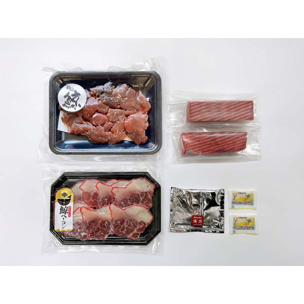 内容:鯨刺身用赤肉100g×2、鯨畝須ベーコン40g、鯨竜田揚げ150g、ポン酢30g、おろししょうが2.5g×2(ニタリ鯨またはイワシ鯨またはナガス鯨)