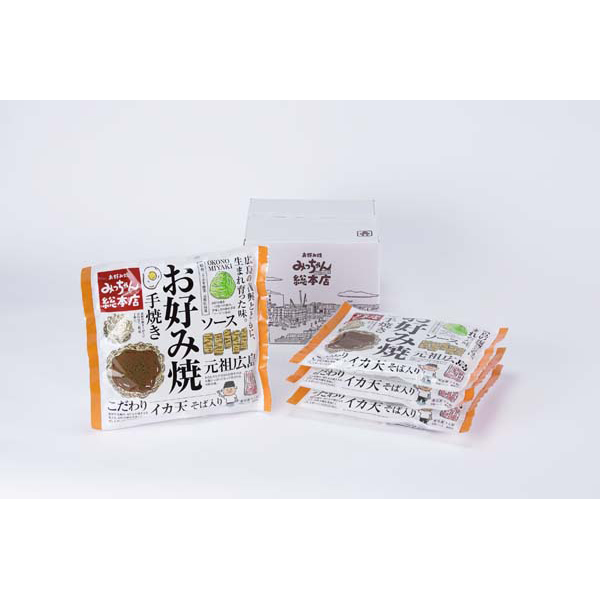 昭和25年創業。みっちゃん総本店が広島の味を広めたい思いから作り出した冷凍お好み焼です。たっぷりのキャベツ、豚肉、玉子、そば(中華麺)に、人気トッピングの「イカ天」が入った4枚セット。電子レンジで温めてから特製ソースと青粉をかけてお召し上がりください。