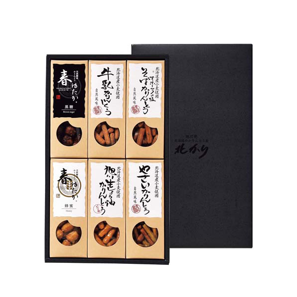 内容:天然酵母かりんとう春ゆたか(黒糖、蜂蜜)、牛乳かりんとう、旭川生しょう油かりんとう、そばかりんとう、やさいかりんとう×各70g