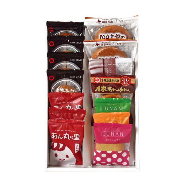 内容:月寒あんぱん プレミアム×4、月寒あんぱん【復刻版】×2、月寒あんぱん こしあん×1、月寒あんぱんショコラ×1、LUNAN(メロン、かぼちゃ、小豆)×各1、あん丸の里(あん丸、とうきび丸、いちご丸)×各1