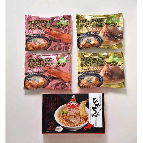 内容:ひでちゃん小麦かに甲羅みそラーメン(生麺)×2、海鮮乾麺えびみそラーメン121g×2、海鮮乾麺ほたて醤油ラーメン119g×2