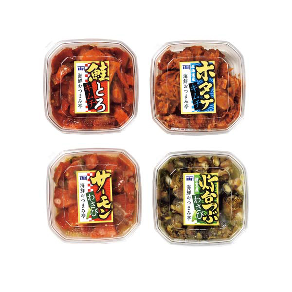 内容:鮭とろキムチ(チリ産)、ホタテキムチ(北海道産)、サーモンわさび(チリ産)、灯台つぶわさび(根室産各120g