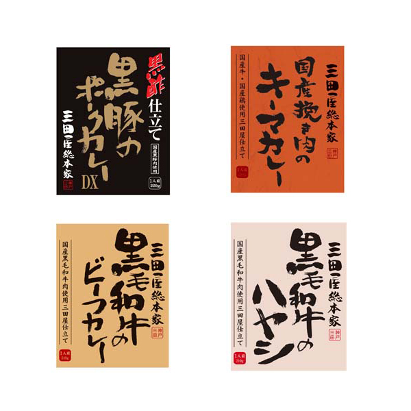 カレールーに黒酢を加え肉は国産黒豚をたっぷりと使用したポークカレーDX、牛挽肉と鶏挽肉の旨味がカレールー全体に溶け込んだスパイシーなキーマカレー、国産黒毛和牛肉をたっぷり使用した贅沢なビーフカレー、黒毛和牛を使用したトマトの酸味と黒毛和牛の旨味が絶妙なこだわりビーフハヤシの4種類が味わえるギフトセット。肉の職人集団三田屋総本家が贈る極上のセレクションギフトです。