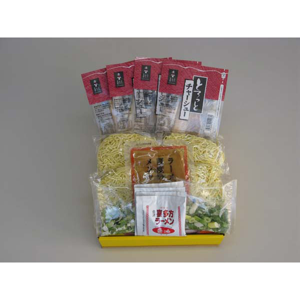 内容:生麺120g×4、醤油スープ35g×4、チャーシュー15g×4、メンマ50g×1、フリーズドライネギ1g×4