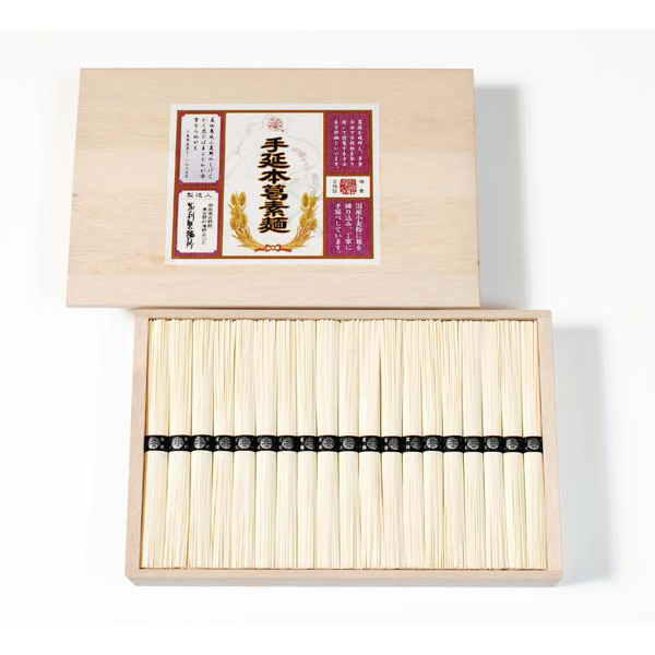 国産小麦に本葛を加え、丁寧に手延べ致しました。葛入りならではのツルツルとした喉越しと、手延べによるコシの強さが自慢です。