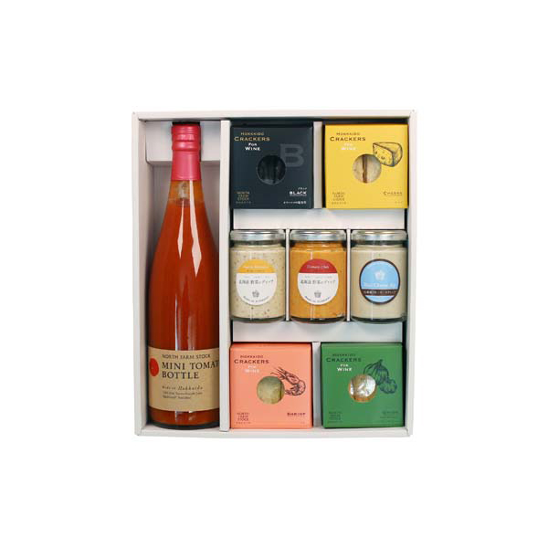 内容:ミニトマトボトル720ml、北海道クラッカー55g×4(ブラック、チーズ、えび、オニオン×各1)、野菜のディップ120g×2(オニオンマスタード、トマトチリ×各1)、ブルーチーズディップ120g