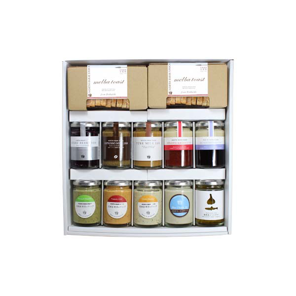 内容:メルバトースト11枚入×2、ジャム140g×5(ベリーベリー、エスプレッソミルク、ピュアミルク、ストロベリーミルク、ブルーベリーミルク×各1)、野菜のディップ120g×3(ブロッコリーワサビ、トマトチリ、オニオンマスタード×各1)、ブルーチーズディップ120g、バーニャカウダ120g