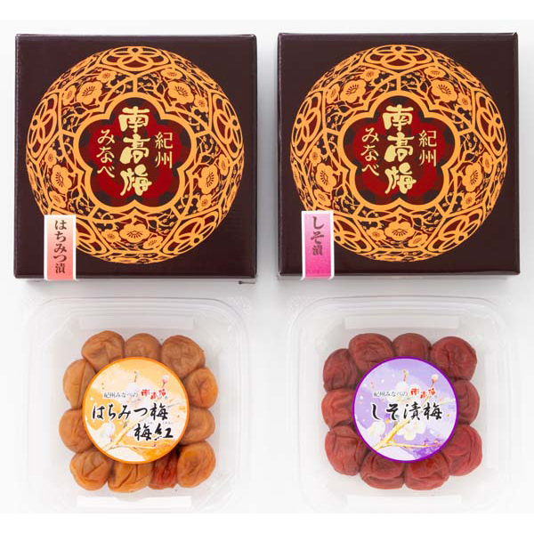 内容:紀州みなべの南高梅しそ漬梅干250g(塩分13%)、 紀州みなべの南高梅はちみつ漬梅干250g(塩分8%)