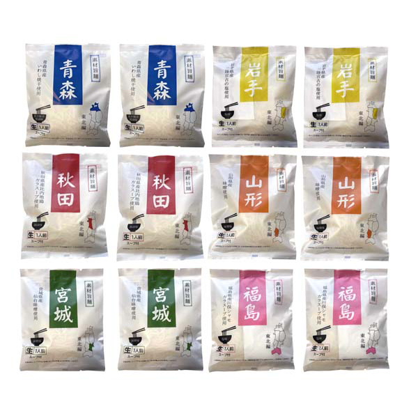 内容:青森魚介豚骨醤油味(めん120g、スープ46g)×2、秋田醤油味(めん120g、スープ40g)×2、岩手磯塩味(めん120g、スープ37g)×2、山形味噌味(めん120g、スープ36g)×2、宮城辛味噌味(めん120g×スープ45g)×2、福島鶏塩味(めん120g、スープ39g)×2