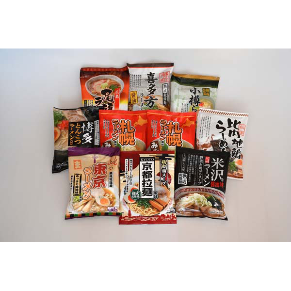 内容:札幌味噌味(麺70g、スープ40g)×2袋、小樽塩味(麺70g、スープ39g)、秋田比内地鶏醤油味(麺70g、スープ40g)、米沢醤油味(麺70g、スープ31g)、喜多方醤油味(麺70g、スープ36g)、東京醤油味(麺70g、スープ35g)、京都醤油味(麺70g、スープ35g)、尾道醤油味(麺70g、スープ40.5g)、博多とんこつ味(麺70g、スープ32g)×各1袋
