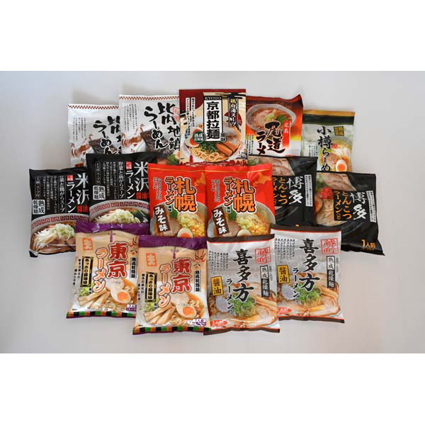 内容:札幌味噌味(麺70g、スープ40g)、秋田比内地鶏醤油味(麺70g、スープ40g)、米沢醤油味(麺70g、スープ31g)、喜多方醤油味(麺70g、スープ36g)、東京醤油味(麺70g、スープ35g)、博多とんこつ味(麺70g、スープ32g)×各2袋、小樽塩味(麺70g、スープ39g)、京都醤油味(麺70g、スープ35g)、尾道醤油味(麺70g、スープ40.5g)×各1袋