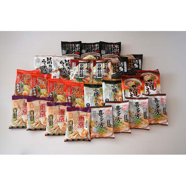 内容:札幌味噌味(麺70g、スープ40g)、喜多方醤油味(麺70g、スープ36g)、東京醤油味(麺70g、スープ35g)×各4袋、米沢醤油味(麺70g、スープ31g)×3袋、小樽塩味(麺70g、スープ39g)、秋田比内地鶏醤油味(麺70g、スープ40g)、京都醤油味(麺70g、スープ35g)、尾道醤油味(麺70g、スープ40.5g)、博多とんこつ味(麺70g、スープ32g)×各2袋