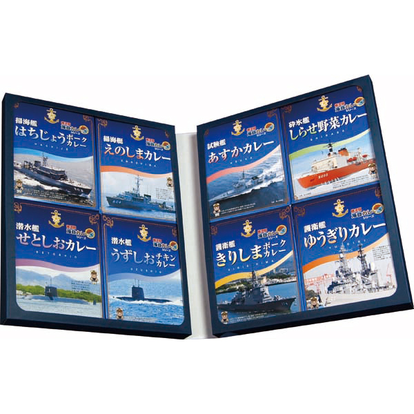 自衛隊の協力のもと、各艦の給養員長から提供していただいたレシピを地元のカレー店が忠実に再現した「横須賀海上自衛隊カレー」全8種を、豪華美麗な箔押し化粧箱に詰め合わせました。