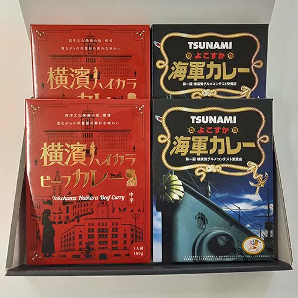 内容:横濱ハイカラビーフカレー180g×2、TSUNAMIよこすか海軍カレー200g×2