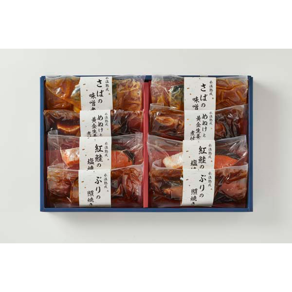 内容:めぬけと黄金生姜の煮付け100g×2、さばの味噌煮90g×2、紅鮭の塩焼き60g×2、ぶりの照焼き90g×2